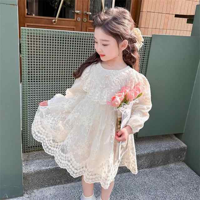 子供ドレス 女の子 キッズ ワンピース チュールワンピース 丸首 長袖 春秋 総レース チュール 膝下 ピアノ発表会 七五三 結婚式 演奏会 発表会 フォーマル ドレス プリンセス かわいい きれいめ 姫様 ジュニア プリンセスドレス ワンピ プリンセス ベージュ