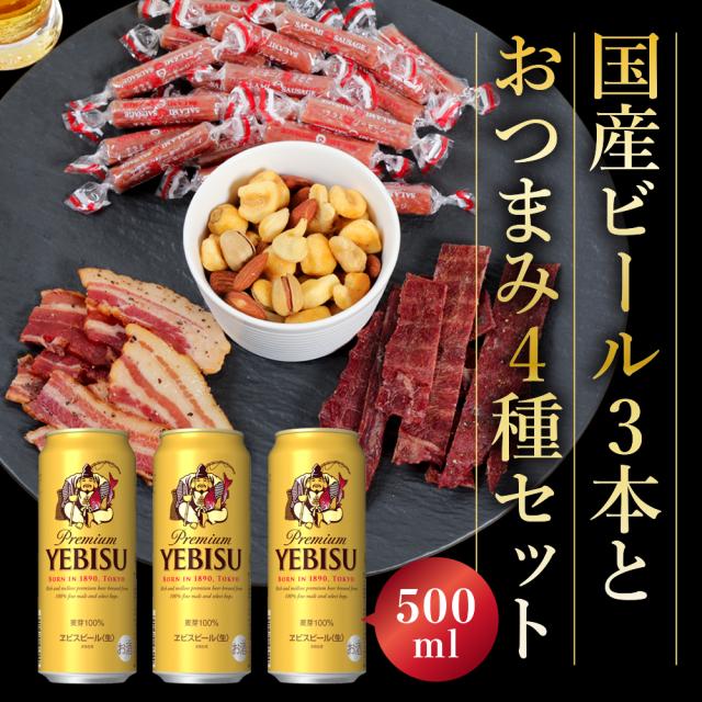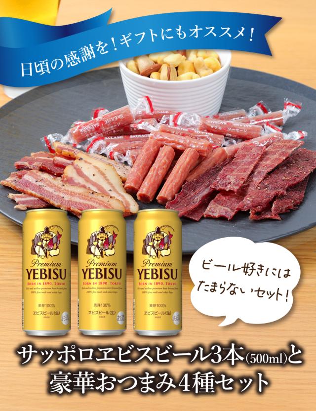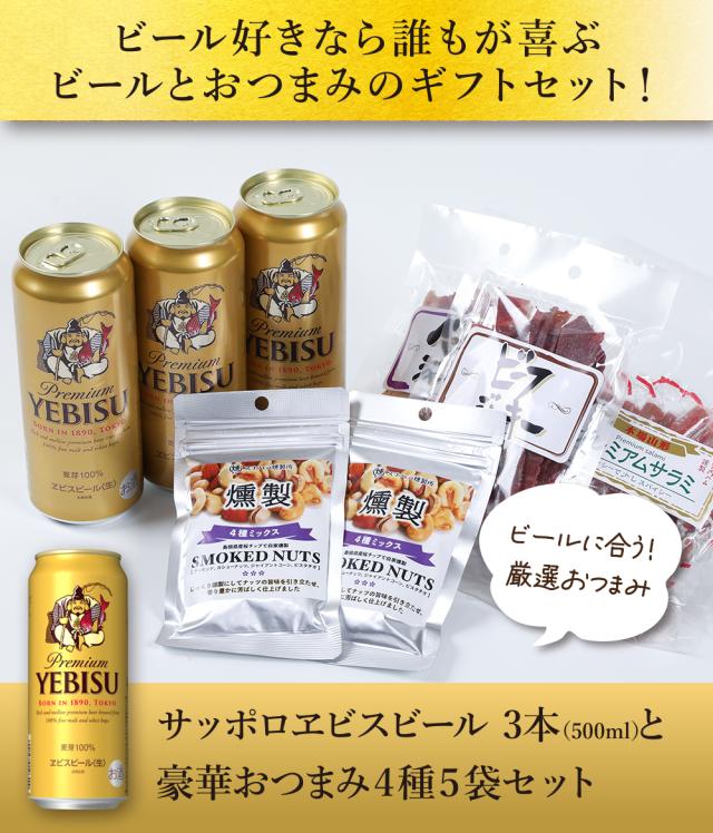 母の日 父の日 ビール おつまみ ギフトセット エビス 500ml 3本とおつまみ5袋 セット お父さん 誕生日 サッポロ ビール お酒 お祝い 結婚式 両親 父 男性 母 女性 父の日ギフト プレゼント 酒 父の日 お酒 おつまみ セット 宮内ハム ナッツ