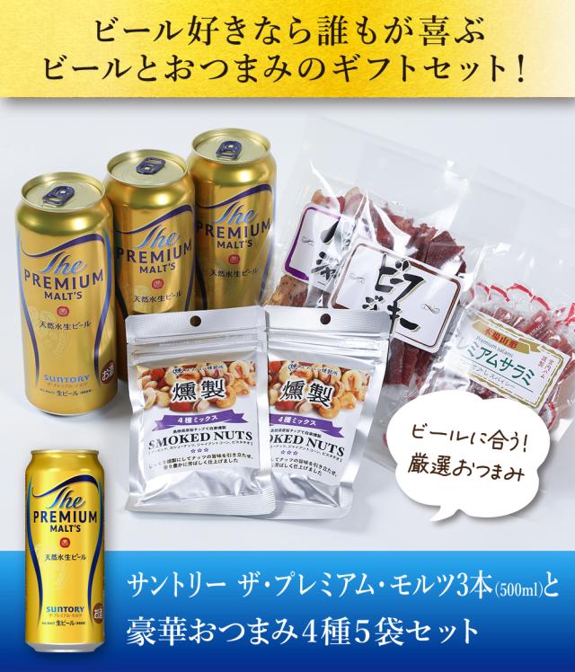 まだ間に合う 年末年始 ギフト プレゼント Pontaパス会員 お酒 ビール おつまみ ギフトセット サントリー ザ・プレミアムモルツ 500ml 3本とおつまみ5袋 セット