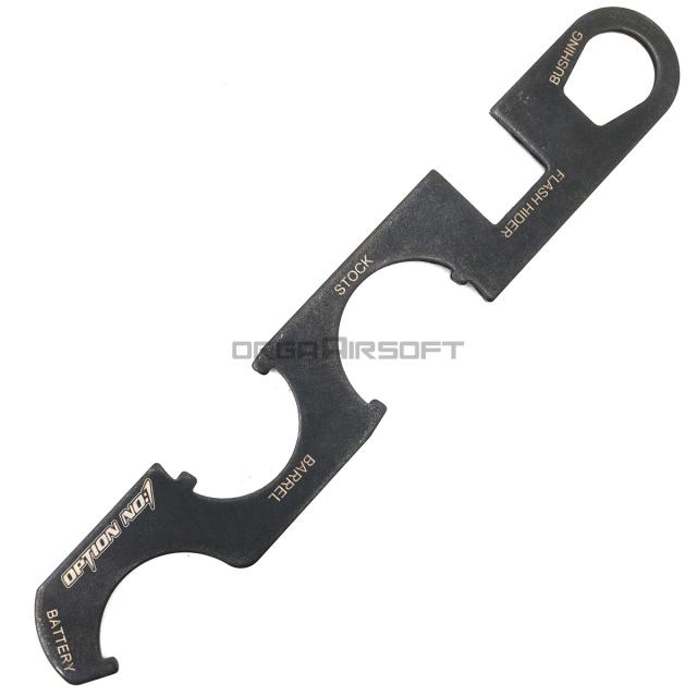 オプションNo.1製のスチール製レンチです。アウターバレル固定リング、ストック固定リング、フラッシュハイダー、バレルブッシングやバッテリーカバーの取り外しにも対応した多機能ツールとなります。