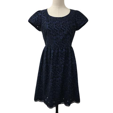 【中古】ミッシュマッシュ ワンピース フレア ギャザー ミニ 総柄 刺繍 スカラップ 半袖 M 紺 青 ネイビー ブルー