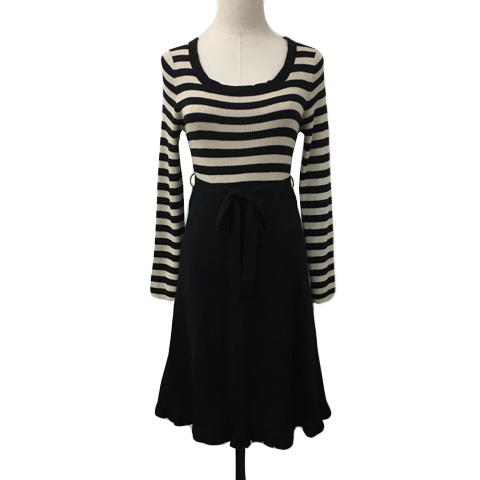 【中古】ストロベリーフィールズ ワンピース ニット フレア 膝丈 切替 ボーダー ウール 長袖 黒 白