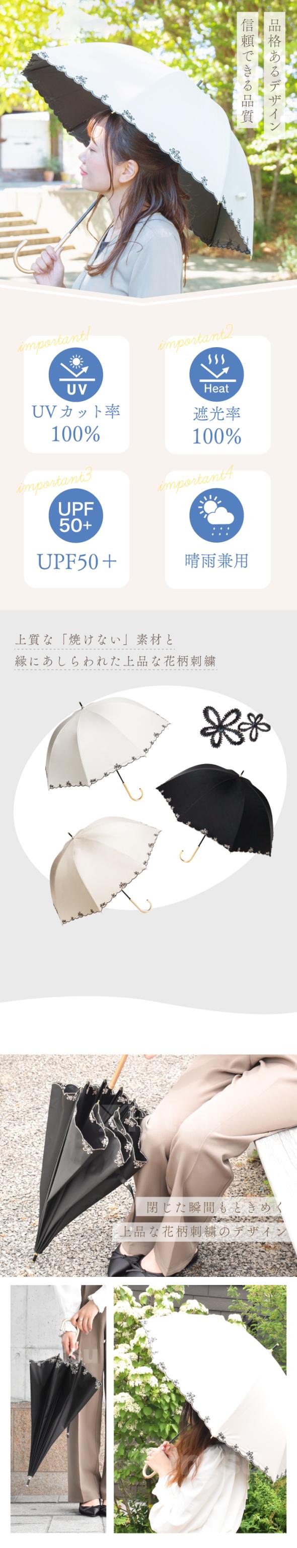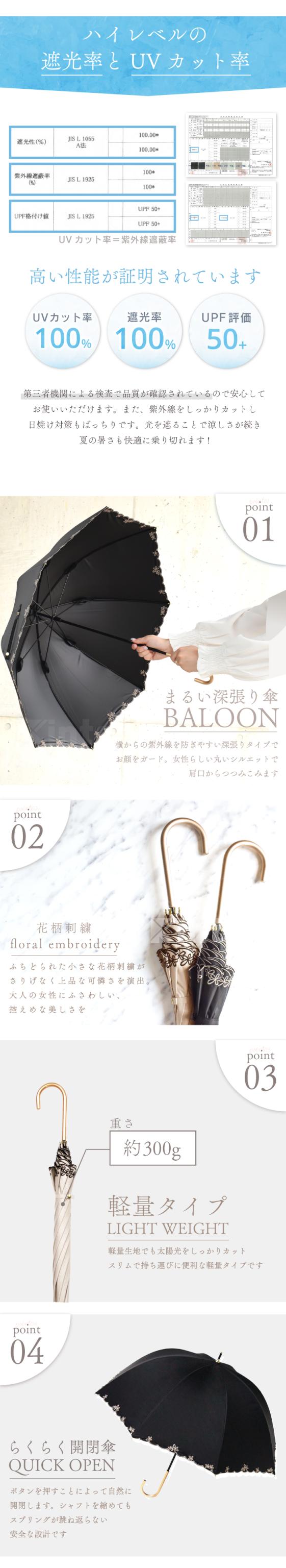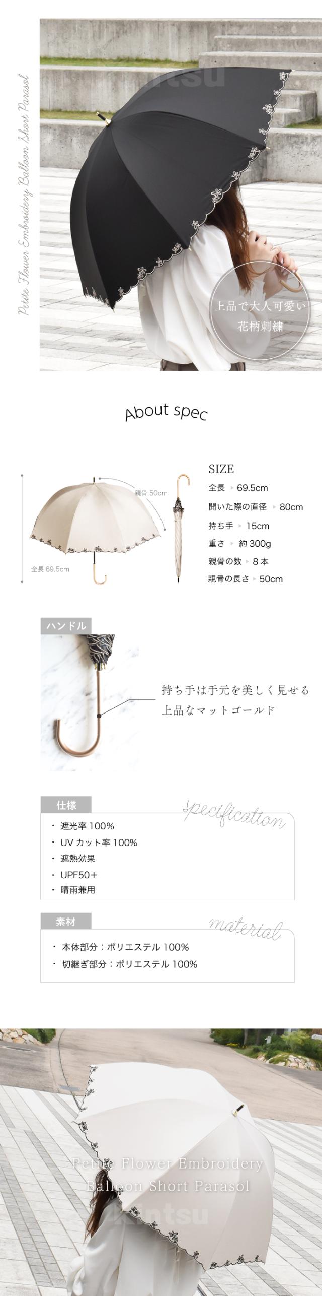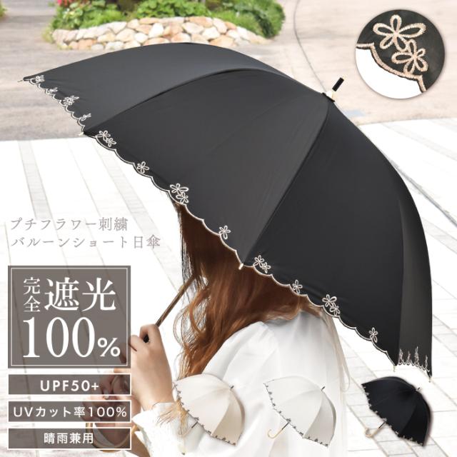 日傘 プチフラワー刺繍バルーンショート日傘 遮光率100% 晴雨兼用 長傘 UVカット 日焼け対策 花柄 刺繍 傘 レディース 軽量 送料無料