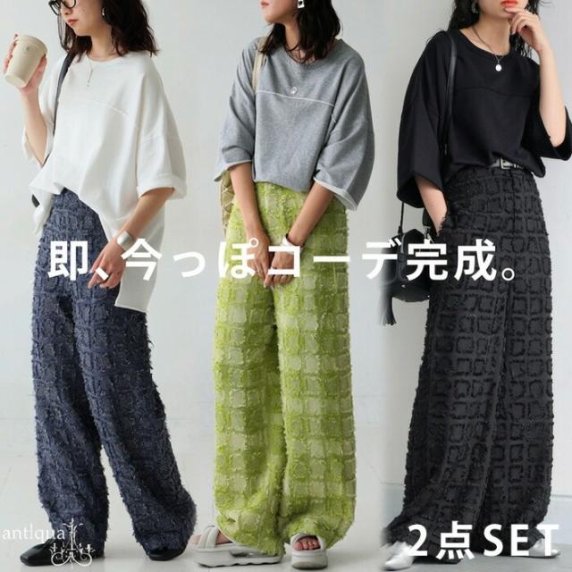 code-00048 トップス プルオーバー パンツ ワイドパンツ セットアップ 半袖 綿100 コットン 綿 カットソー フリンジ ジャガード ゆったり 体型カバー 春 夏 着回し