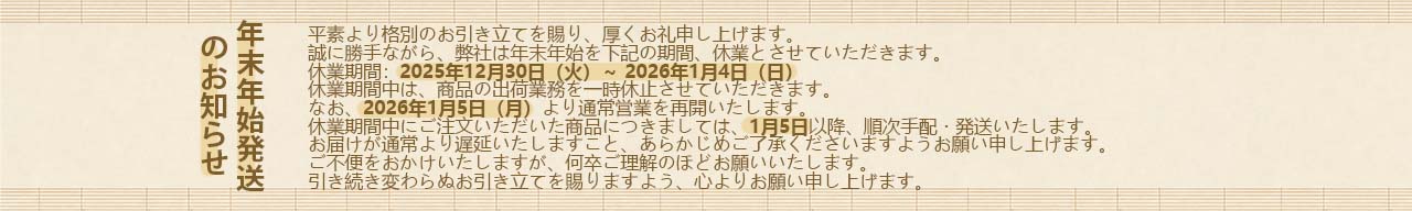 誠に勝手ながら、弊社は、年末年始に2025年12月30日(火)〜2026年1月4日(日)までを休業となりました。 この期間のご注文は1月5日以降の順次に手配。