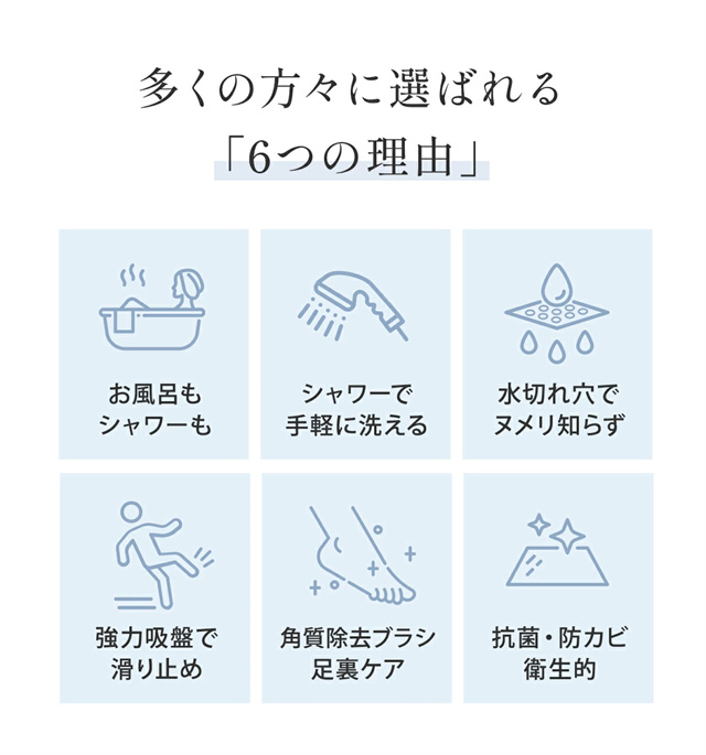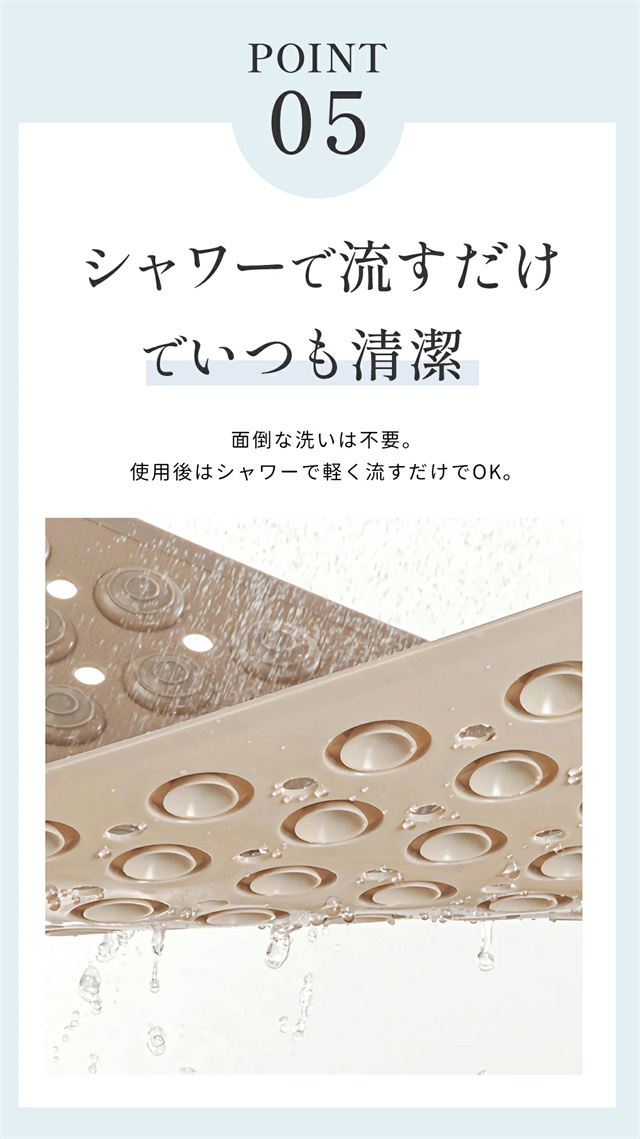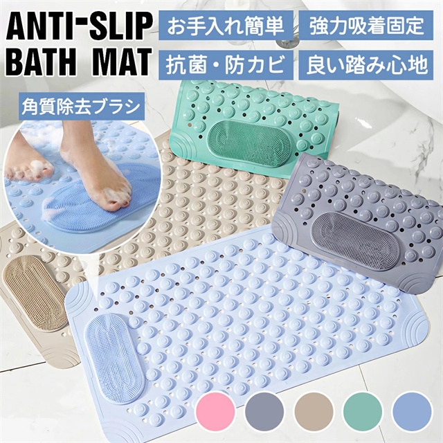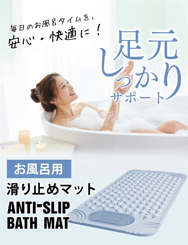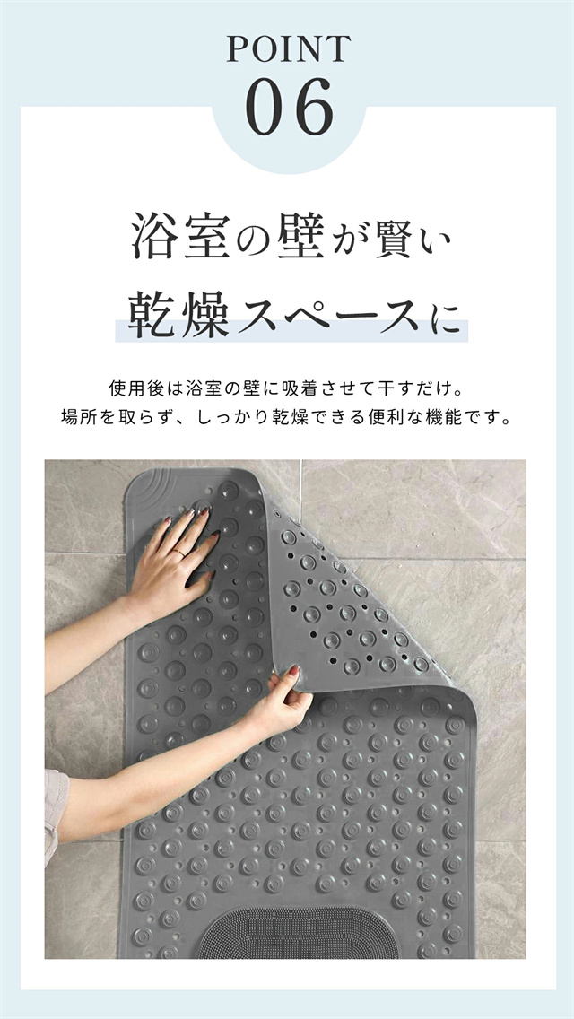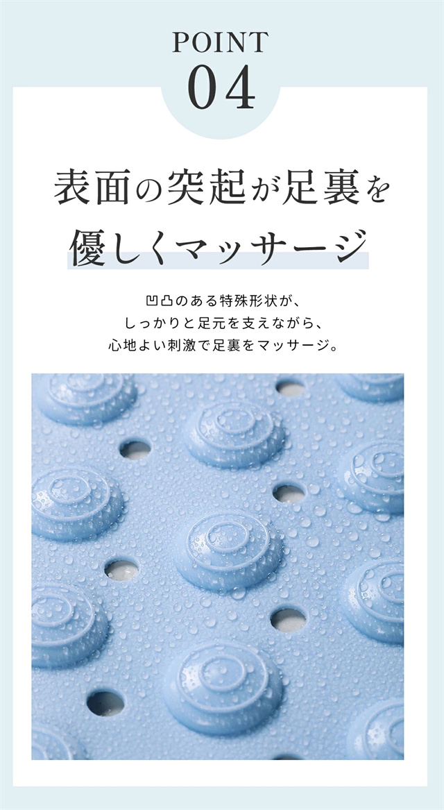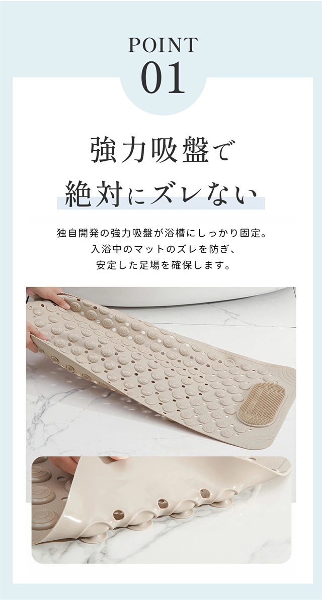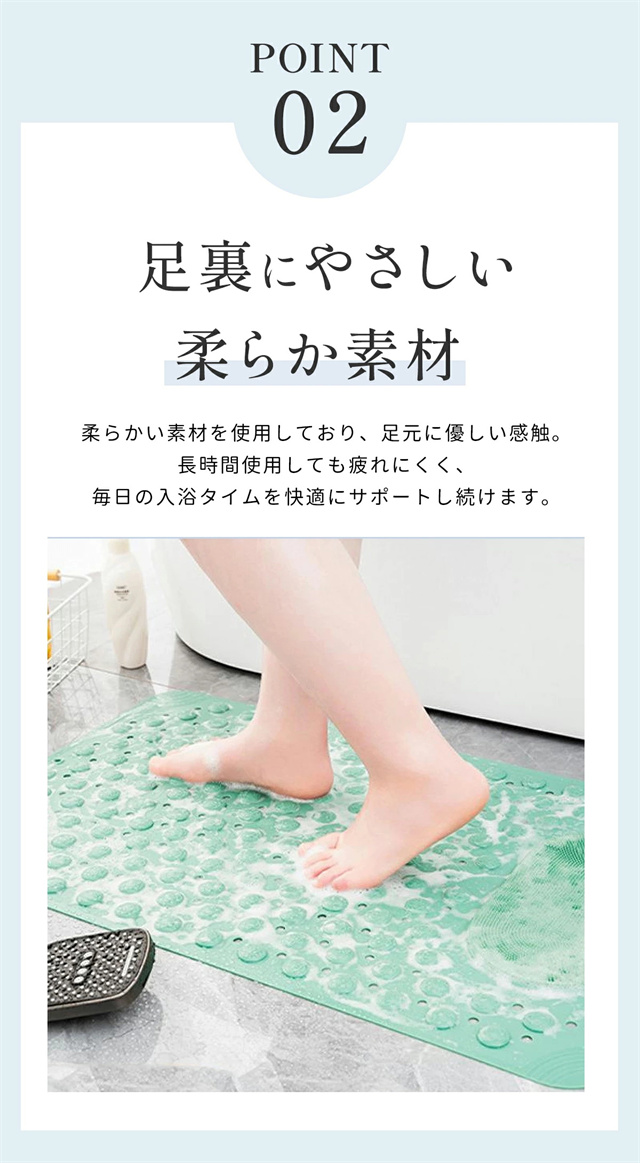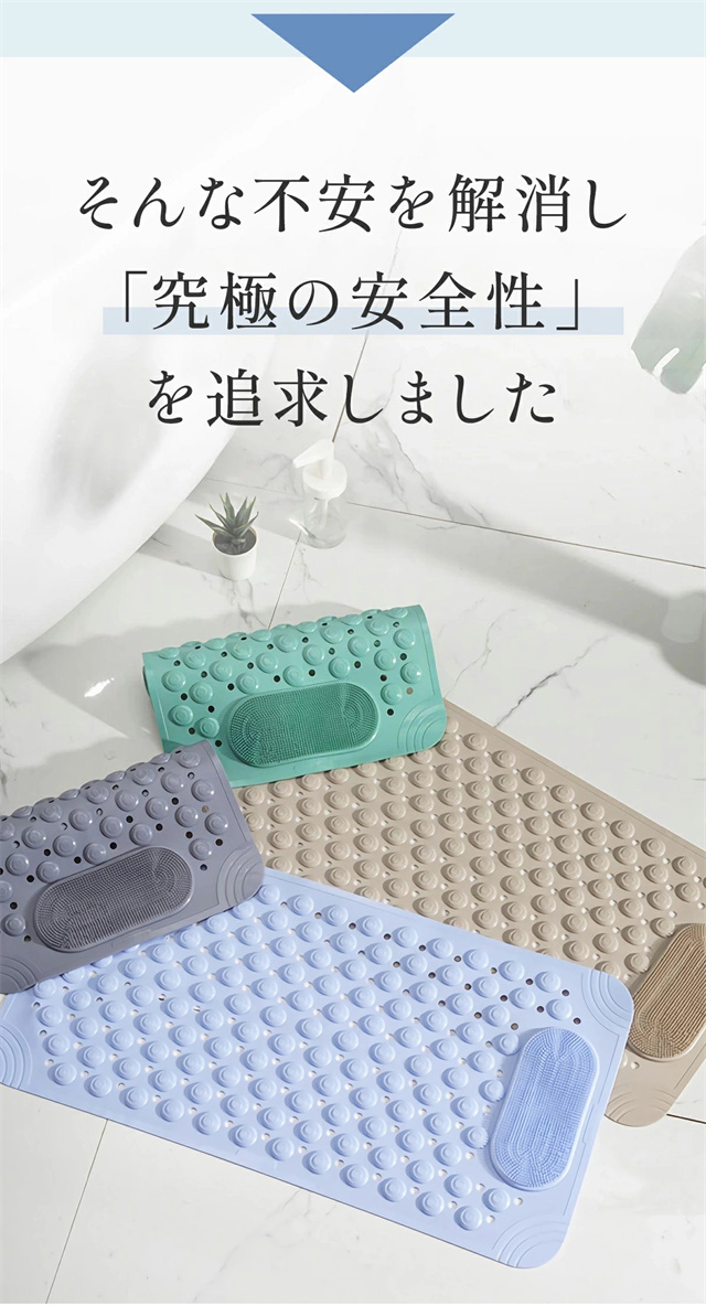【吸盤式で優れた安定性!滑り止めデザイン】 滑り止め機能にこだわって作られたお風呂マットです。裏面にたくさんの強力吸盤が付いているため、接続面が濡れても滑りにくく、浴槽の底面や浴室の床にしっかり固定されています。表面が凸凹加工が施してあり、洗い場で足を滑らせるリスクを軽減し、浴槽内に設置すると長時間の半身浴時に姿勢を安定させやすいのも魅力です。 【フットブラシ機能で足の角質をケア】 浴室マットに楕円形の短めの毛を使用したフットブラシが付いています。石鹸やボディソープを使うと泡立ちが良く、お風呂で洗いながら足指の間など隅々まで洗い、足臭の原因である角質を除去できます。 【足つぼ効果に期待】 滑り止めマットの立体突起を踏むことで、気持ちよく足裏が刺激されます。毎日の疲れを癒し、リラックスとストレス解消を促進します。 【足元とお肌に優しい柔らかい素材】 高品質のPVC素材で作られて柔らかく快適な使用感になっているすべり止めマット。程よい弾力によりクッション代わりになるので、浴槽に座るのが苦手の方にもおすすめです。毎日のバスタイムを手軽にワンランクアップ! 【シャワーで流すだけで清潔】 浴槽マットに穴が開いているため水切れが良いのが特徴です。通気性がよく、防カビ効果もあります。使用後、浴室にシャワーで流すだけで表面の汚れを簡単に落とします。吸盤がついているため、浴室の壁に吸着すると省スペースに水気を切ることができます。 【どこでもお使いいただけます】 浴槽内・浴室の床・脱衣所・タイルの床など、吸盤が貼り付け可能な場所であれば、どこでも使用できます。滑りづらい加工がされていると安心。滑りや転倒を防ぎ、子供や高齢者がいる家庭にも適しています。介護向けお風呂用滑り止めマットです。 |