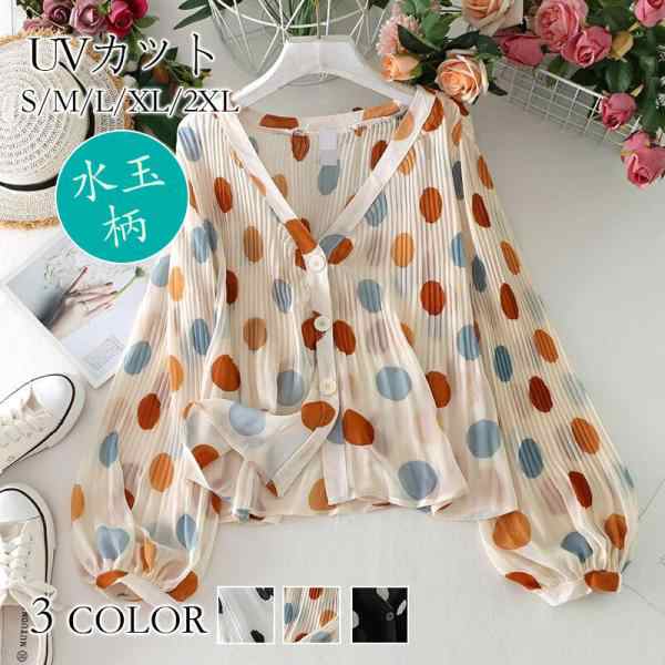 シフォンブラウス レディース 水玉柄 Vネック 長袖 パフスリーブ カーディガン カジュアル UVカット 紫外線対策 ゆったり きれいめ おしゃれ