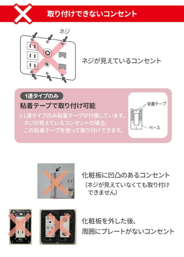 コンセントのプレートやプラグの形状、サイズによっては取り付け、使用ができない場合がありますので注意してください。