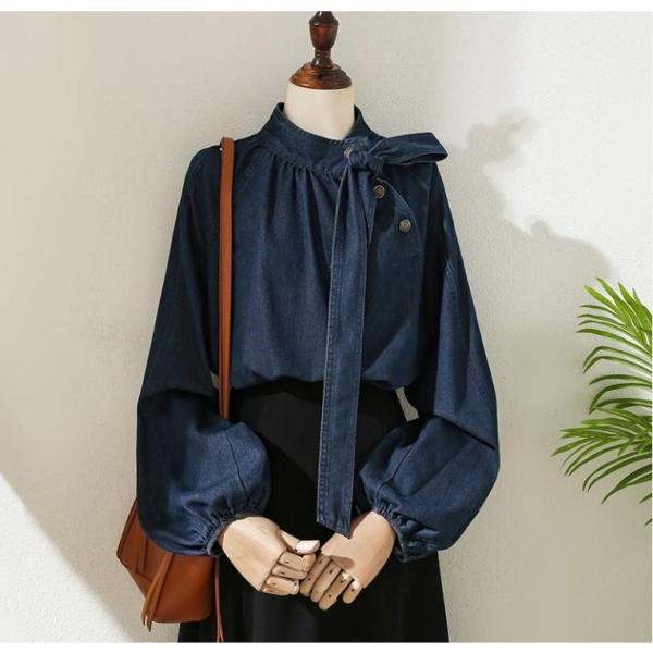 ブラウス レディース トップス シャツ デニム 立ち襟 フリル リボン ボウタイ 長袖 2022 春 春服