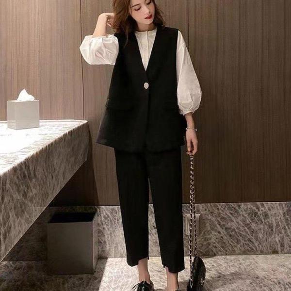 セットアップ スーツ フォーマル シャツ ベスト パフスリーブ バンドカラー 七分袖 アンクル丈 パンツ スーツ 春 秋 かっこいい 長袖 レディース 黒 白 襟付き 無地 3点セット クロップドパンツ ビジネス コーデ 通勤 お呼ばれ パーティー 衣装 パンツドレス ミニマル シンプル すっきり カジュアル レトロ おしゃれ 大人女子 シンプル こなれ感 抜け感 10代 20代 30代 40代 ママ モテ コーデ スタイル 韓国系 ファッション