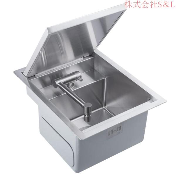 【機能のメリット】:はめ込み式のシンクと水切りで、折り畳み式の蛇口(冷温水栓付き)を入れる穴があり、お手入れも簡単です。ラスリッドは、使用しないときや折りたたんだときに便利な余分な作業スペースになります。移動式キャリッジ用のステンレス鋼シンク。