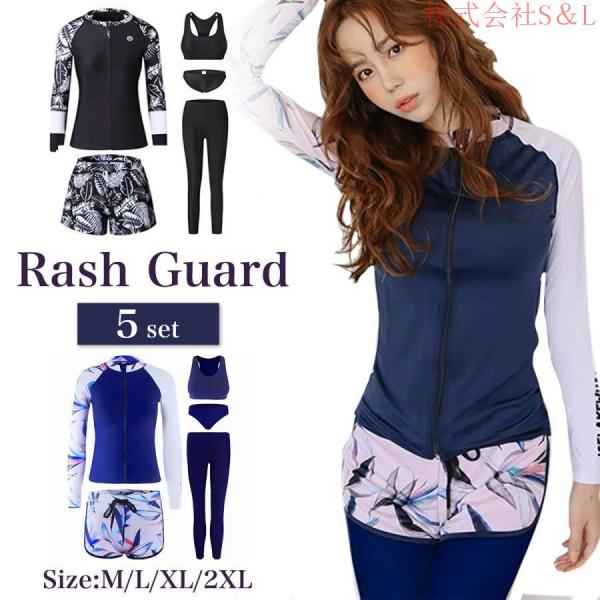 長袖ラッシュガード、ショートパンツ、レギンス、ビキニ上下のレディース 水着 5点セット