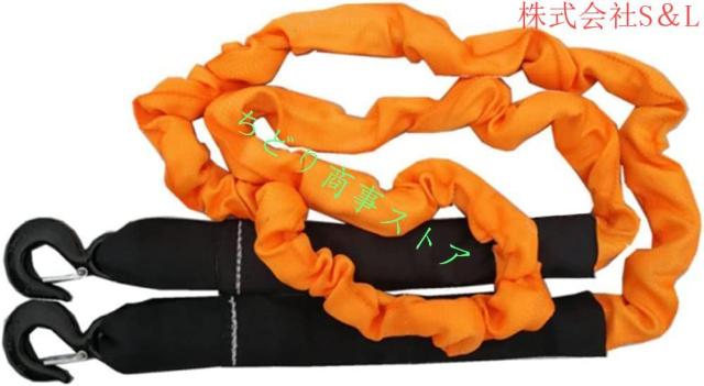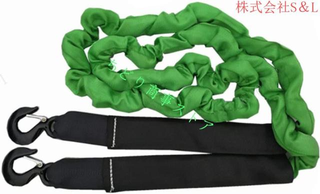 車用牽引ロープ仕様:最大破断力: 14T、全長: 5 Mロープ、ロープ長: 4m、フック部分直径: 4cm、フック開閉部幅: 3cm、フック材質: 合金鋼、重量:3.2 kg