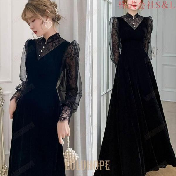 ロング ドレス パーティードレス 個性的 黒 袖あり 長袖 レース おしゃれ 結婚式 二次会 お呼ばれ 演奏会 ピアノ 発表会 ドレス 大人 かっこいい 可愛い シフォン ブラウス風 花柄 スタンドカラー シャーリング キャンディースリーブ パール 透け感 ベロア ベルベット 切り替え カッコイイ 2XS XS S M L XL 2XL 大きいサイズ お呼ばれ パーティー イベント 舞台 モデル 撮影 衣装 韓国 イブニング ブラックドレス ロング丈