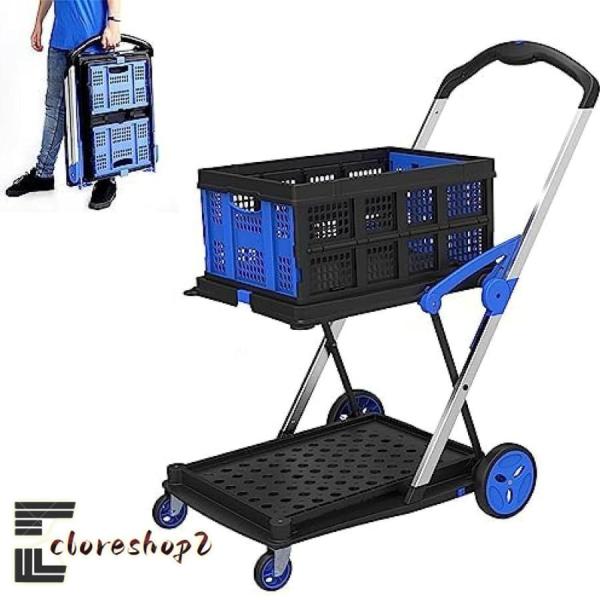 多機能二層折りたたみカート2段台車移動式折りたたみトロリー収納箱付きショッピングカート食料品用S&L屋外ワゴン二層コンテナ付キャリーカートコンテナ