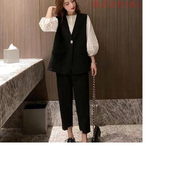 セットアップ スーツ フォーマル シャツ ベスト パフスリーブ バンドカラー 七分袖 アンクル丈 パンツ スーツ 春 秋 かっこいい 長袖 レディース 黒 白 襟付き 無地 3点セット クロップドパンツ ビジネス コーデ 通勤 お呼ばれ パーティー 衣装 パンツドレス ミニマル シンプル すっきり カジュアル レトロ おしゃれ 大人女子 シンプル こなれ感 抜け感 10代 20代 30代 40代 ママ モテ コーデ スタイル 韓国系 ファッション