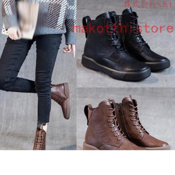 本革レースアップブーツ大きいサイズブーツ牛革レディース袴ブーツショートブーツミドルブーツフラット疲れないフラットS&Lサイドジップ紐靴厚底