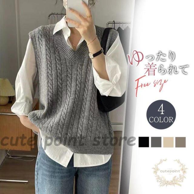 ニットベスト レディース ケーブル編み 学生 重ね着 カジュアル 通勤 可愛い vネック 通学 シンプル 仕事着 セーター 売れ筋 着回し