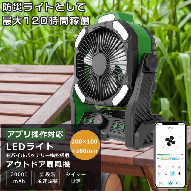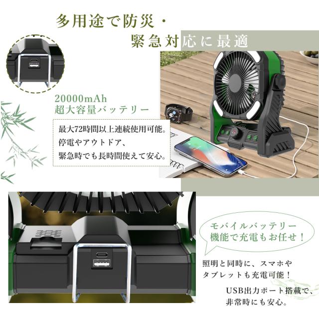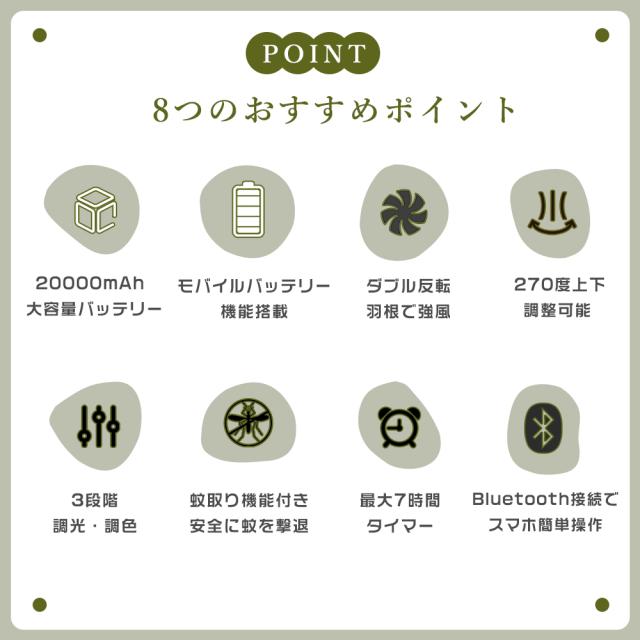 ★持ち運びに便利なコンパクトデザインながら、20000mAhの大容量バッテリーを搭載し、扇風機・ライト・蚊取り・モバイルバッテリー・Bluetooth操作など多機能をひとつに集約。