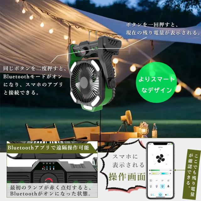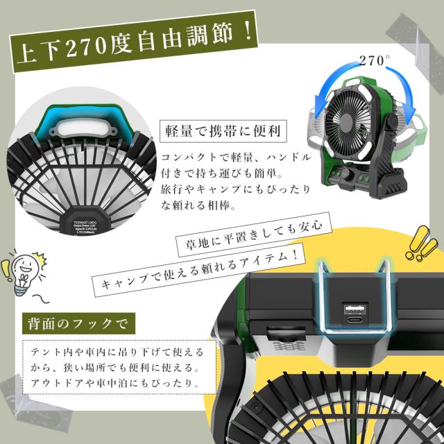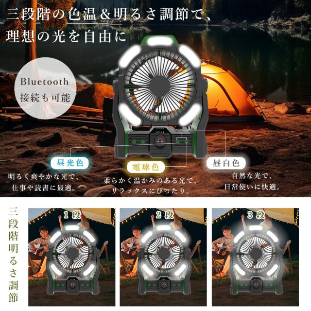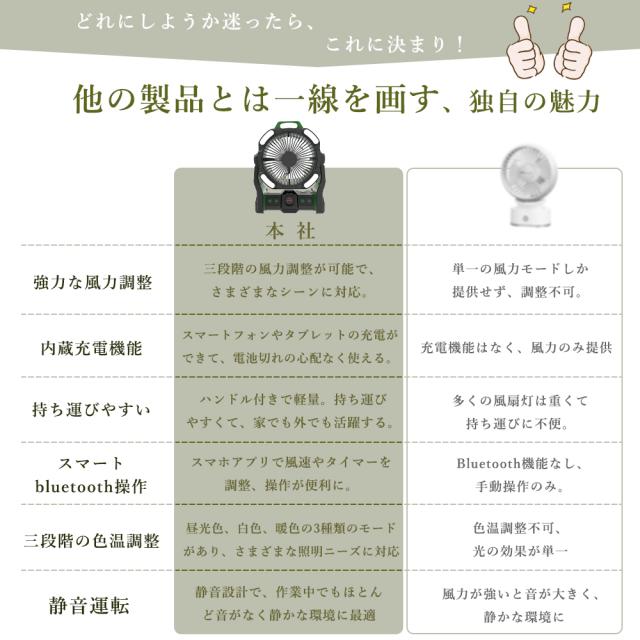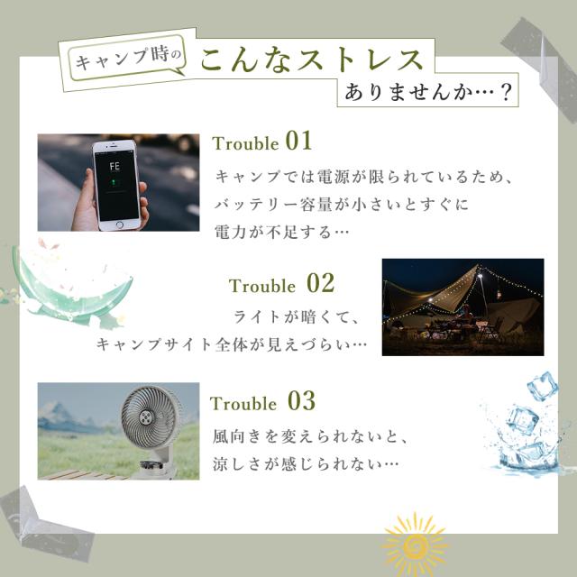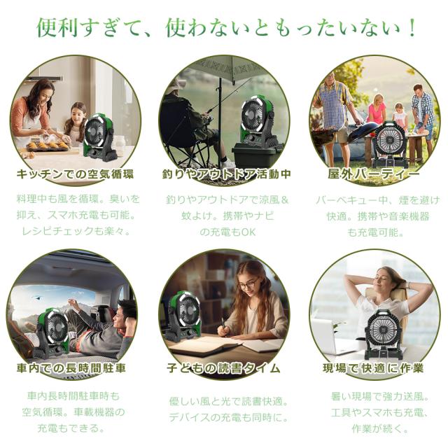 ☆アウトドアや災害時はもちろん、オフィスや寝室など日常使いにも最適。風量や光の調整も自在で、シーズン問わず活躍する万能アイテム。