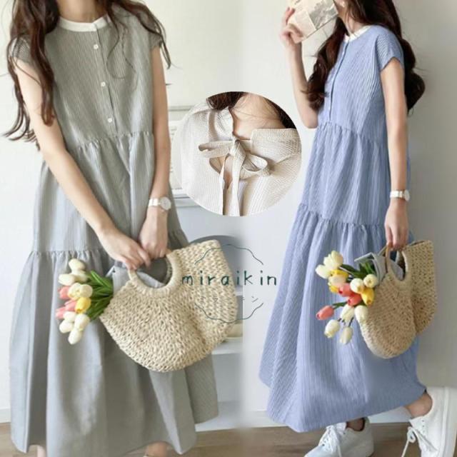 ワンピース レディース フレンチスリーブ ストライプ シャツ ティアードワンピース ロングワンピース ギャザー 可愛い 30代40代50代 無地 リボン付き