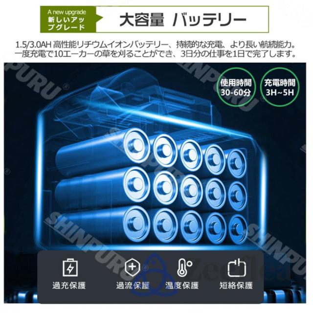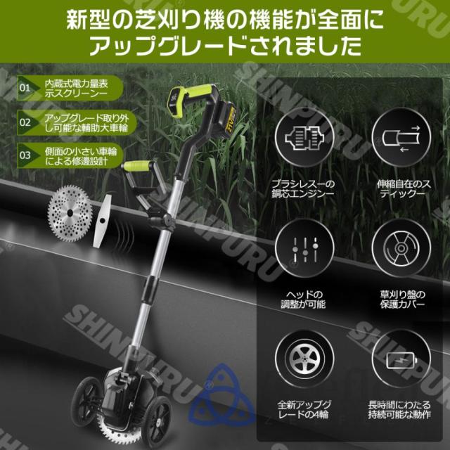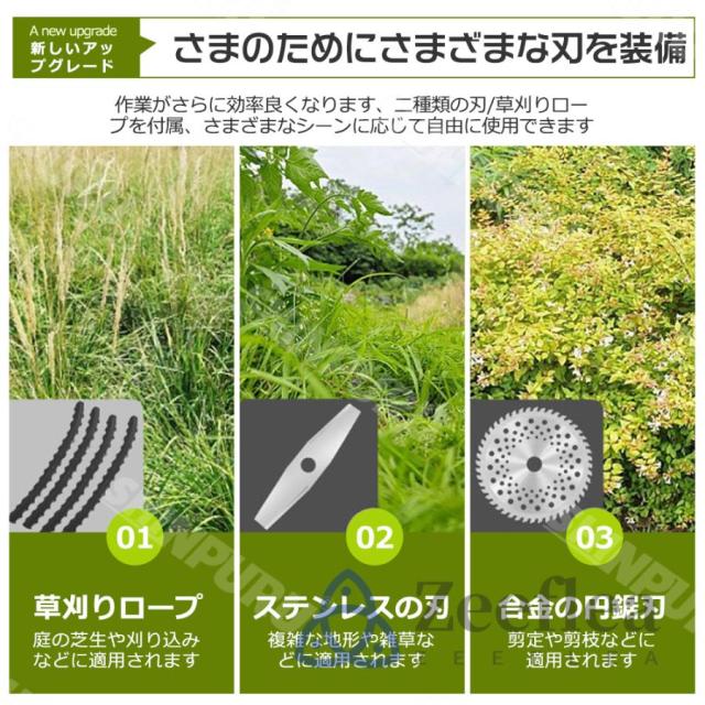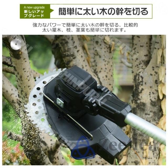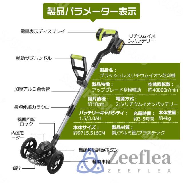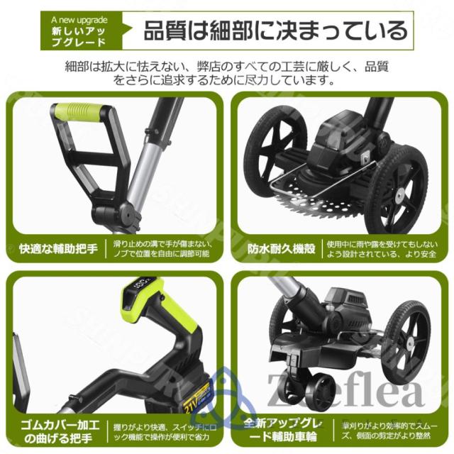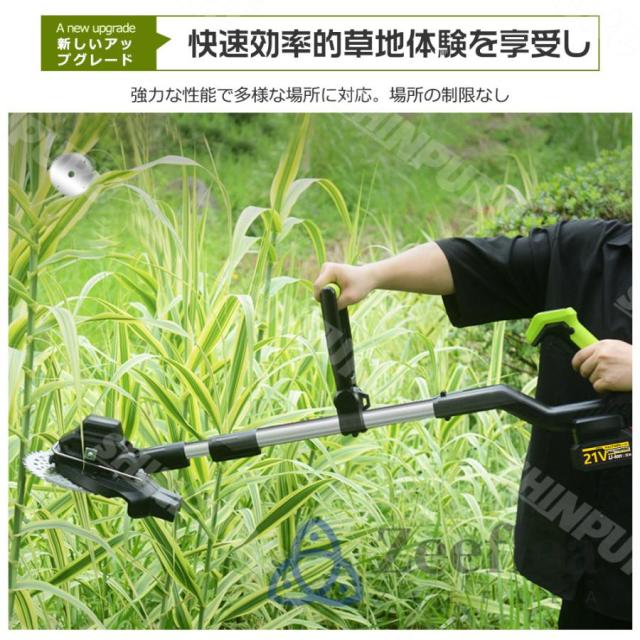 園芸?DIY用途で人気の電動式草刈機。体重量わずか4kg、軽量で使いやすく、力の弱い女性やお年寄りでも簡単に扱えます。コードレスなので使いは便利です。大容量バッテリー、近くに電源がなくても使用できます。高品質純銅モーターを採用し、出力は毎分40000rpmの大出力により、草刈り効率は一層向上することができます。庭に生えた雑草の手入れなどの日常用途に最適。使用面を考えて、ロックと保護カバーを搭載。有効に誤操作防止、作業時の草や小石飛散防止になります。取り付け簡単!刃の交換はたった5分で完了します!どんな年齢層の方でも簡単に取り付けできる設計となっています。