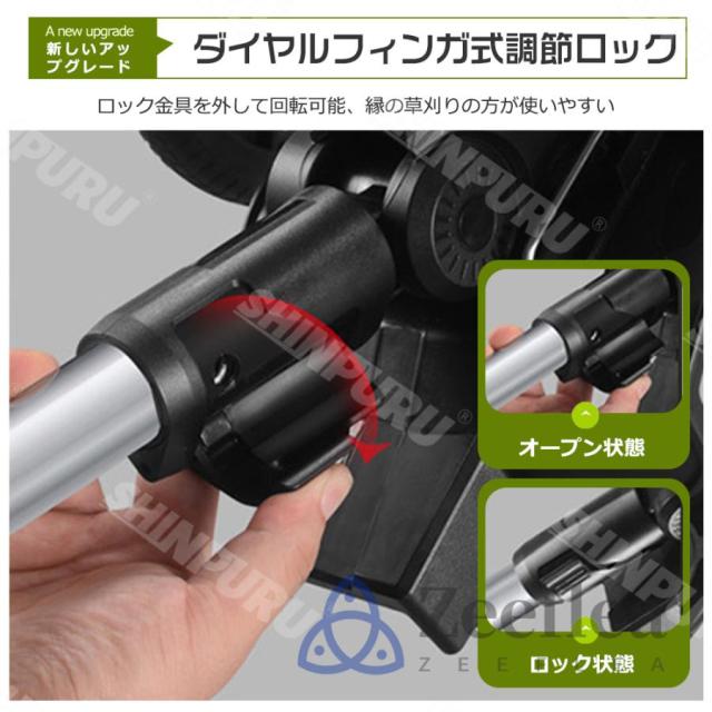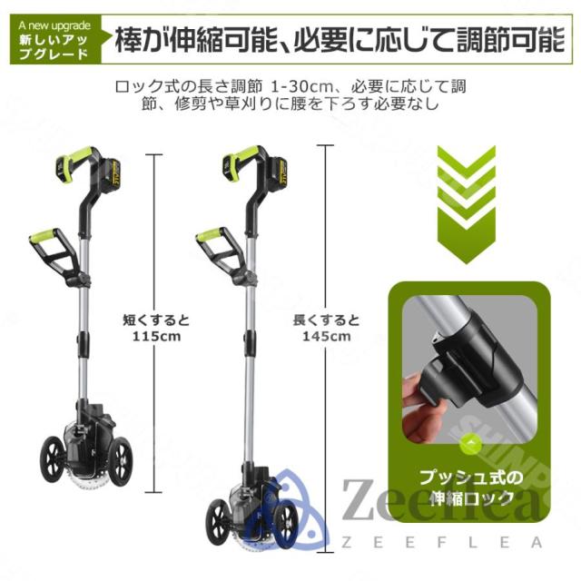伸縮自在で持ち運びラクラク! 芝刈り機伸縮可能なポールが装備され、最大長さは140cmに達し、使用者の身長に応じて柔軟に調整できます。115?145cmの長さに伸縮可能なので、身長に合わせて腰や足に負担が掛からないように調整できます。縮小するすれば車での持ち運びも便利、倉庫への収納にも邪魔になりません。