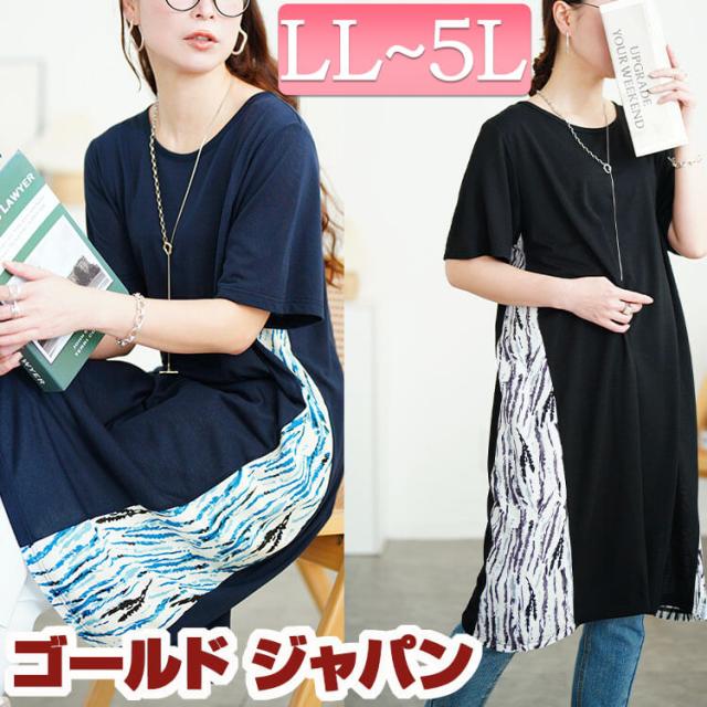 春新作 大きいサイズ レディース ワンピース アート柄サイド切り替えワンピース ワンピ 半袖ワンピース 膝丈 ひざ丈 ミディアム 半袖 5分袖 クルーネック 切り替え ストレッチ 伸縮 柄 無地 ゆったり 春服 夏服 秋服 LL 2L 3L 4L 5L ブラック 黒 ネイビー ゴー イベントセール