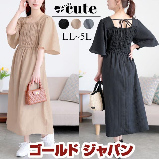 大きいサイズ レディース ワンピース ストライプシャーリングフレアワンピース ワンピ ロング 5分袖 シャーリング フレア ギャザー リボン フレアスリーブ 無地 春新作 春服 夏服 秋服 LL 2L 3L 4L 5L ブラック 黒 グレー グレージュ ゴールドジャパン +cute プラスキュート
