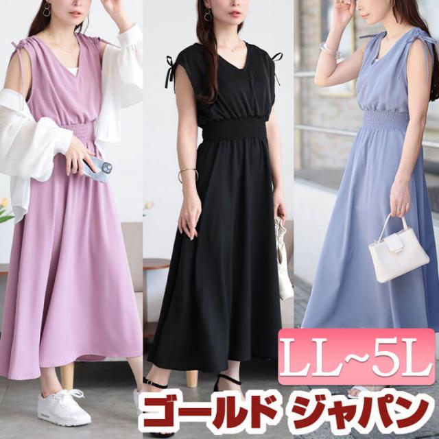 春新作 大きいサイズ レディース ワンピース ドロストショルダーシャーリングワンピース ワンピ ロングワンピース ロング ノースリーブ シャーリング ドロスト ギャザー フレア ゆったり 春服 夏服 秋服 LL 2L 3L 4L 5L ブルー ブラック 黒 ラベンダー ゴール イベントセール
