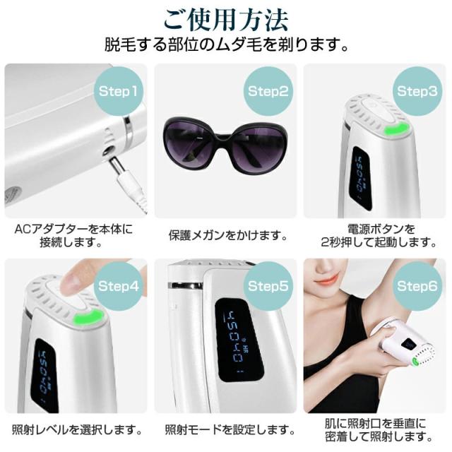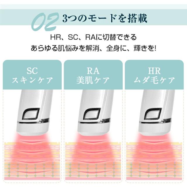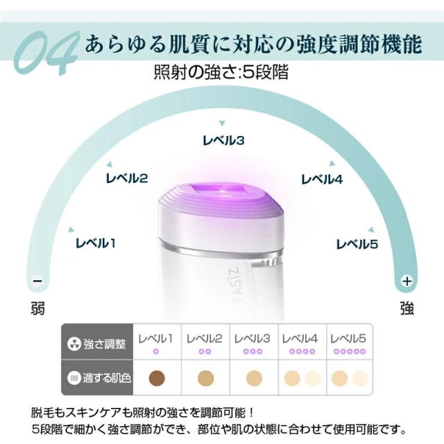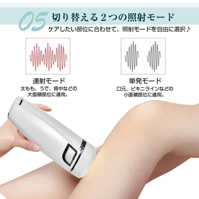 使用部位や肌質に合わせて、照射レベルが5階段に調節でき、ムダ毛ケアの効率がアップ!2つの照射モードを切り替えることができます。手動照射モードは小範囲の脱毛に適しており、自動照射モードは広範囲の脱毛に適しており、全身脱毛を実現できます。