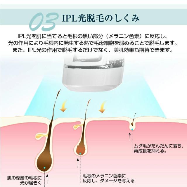 IPL光は効果的に毛のメラニン色素に光を当てることで毛根にダメージを与え、ムダ毛を脱毛します。照射範囲が広く痛みも少ないため、初めての人でも安心して使うことができます。