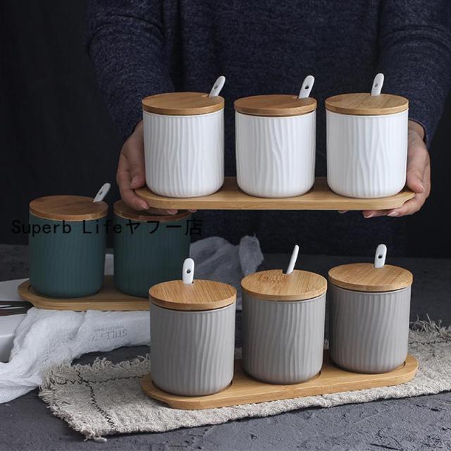 2023新品 調味料入れ 調味料容器 調味料ケース おしゃれ キャンプ 陶器 砂糖 塩 北欧 カバー付き セット 2個 3個 トレイ付き キャンプ用品 収納 防湿 保管