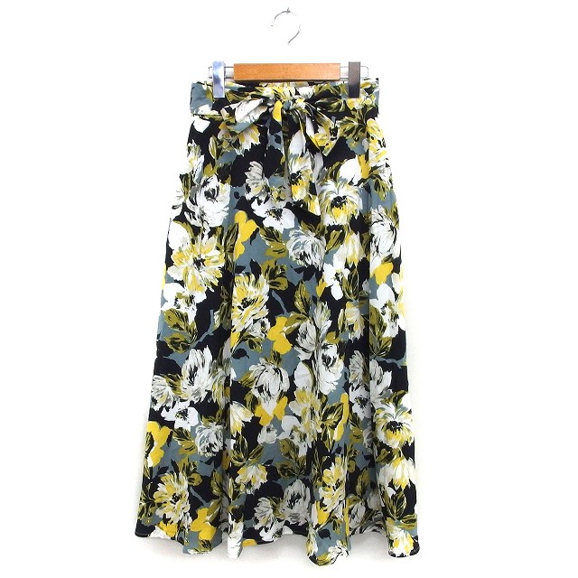 【中古】ロペピクニック ROPE Picnic フレア スカート マキシ丈 花柄 リボン ゆったり 38 黄 イエロー 黒 ブラック