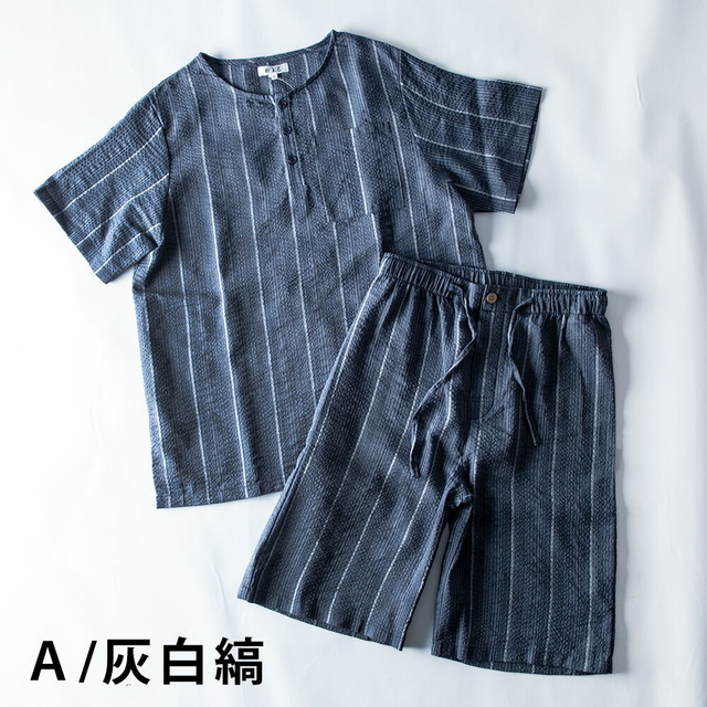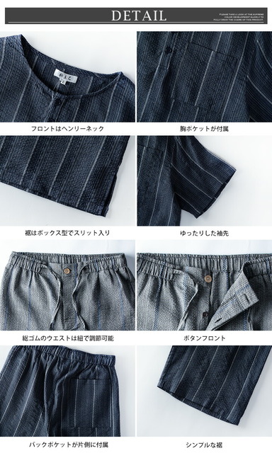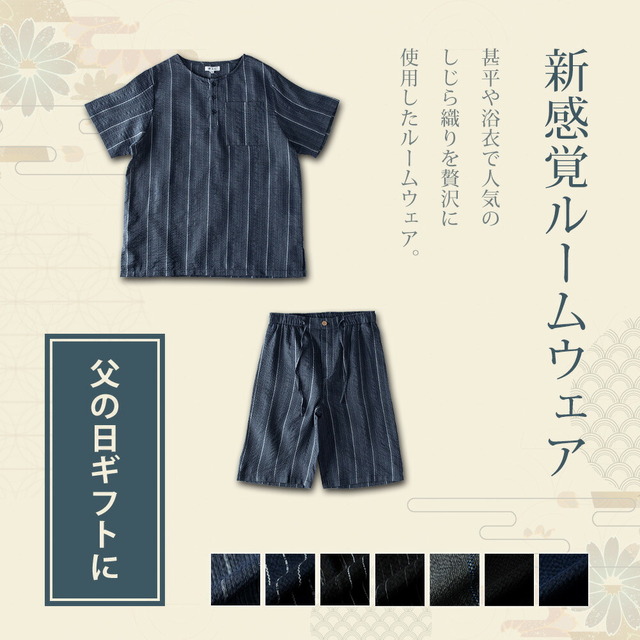 パジャマ 部屋着 ルームウェア メンズ 上下セット ヘンリーネック しじら織 夏 tシャツ ハーフパンツ 短パン 涼しい 無地 ゴムウエスト 総柄 和服 シンプル ストライプ 膝丈 シジラ織 紺 パンツ 全7色 父の日 父の日ギフト おしゃれ 半袖
