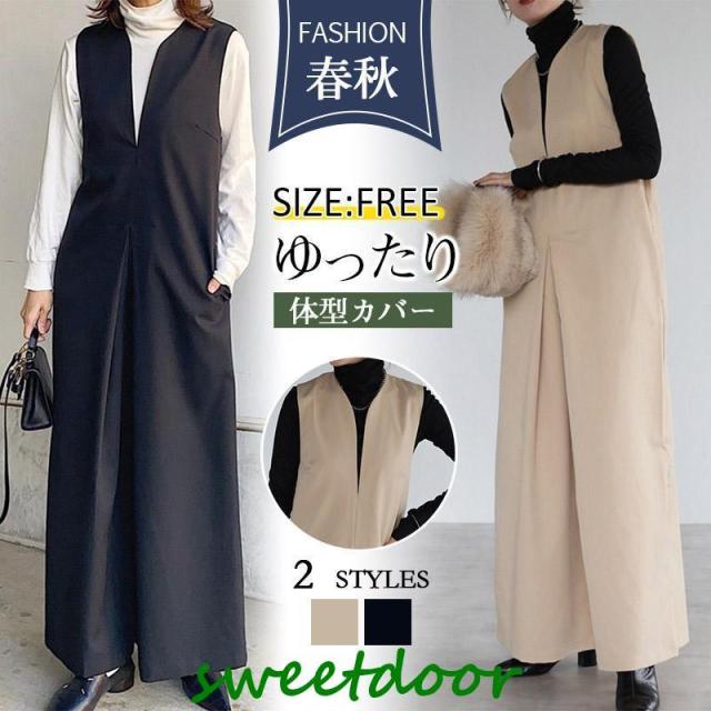 サロペット オーバーオール ディープVネックオールインワン サロペット レディース 40代 50代 30代 20代 春 夏秋 冬 黒 モカ 秋服