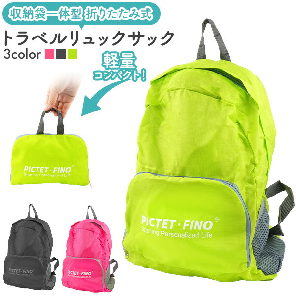 収納袋一体型で軽量コンパクト! 折りたたみ式 トラベルリュックサック 14L。軽量でコンパクトに折りたたみできるトラベルリュックサックは、旅行の予備バッグや日常使いのエコバッグなど様々なシーンで使用できます。使用しない時には小さく折りたたんで収納でき、予備のバッグとして大活躍!収納袋一体型なので、リュックを入れる袋も必要ありません。小さく折りたためるのに、中は大容量!服やタオルを何枚も重ねて入れることができて便利です。外側には大きなポケット、左右側面にはペットボトルなどが入れられるボトルポケット、内側には小物が入れられる小さなポケットも付いています。急な雨でも安心して使える、生活防水加工が施されたナイロン素材。リュックの紐部分は長さ調整が可能なので、男女問わず使用できます。グリーン、ピンク、ブラックの3色からお選び頂けます。