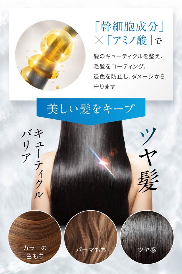 ◆ 【美容液成分×酸熱トリートメント×ダメージケア成分】6種の美容液成分(ヒアルロン酸Na、プラセンタエキス、水溶性コラーゲン、セラミドNG、セラミドNP、セラミドAP)、酸熱トリートメント成分、カラーパーマダメージケア成分を配合。
