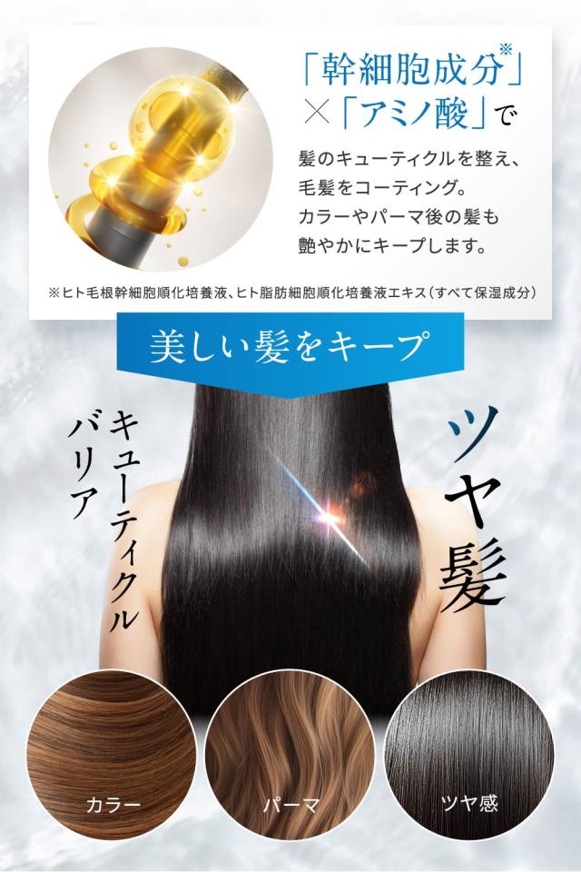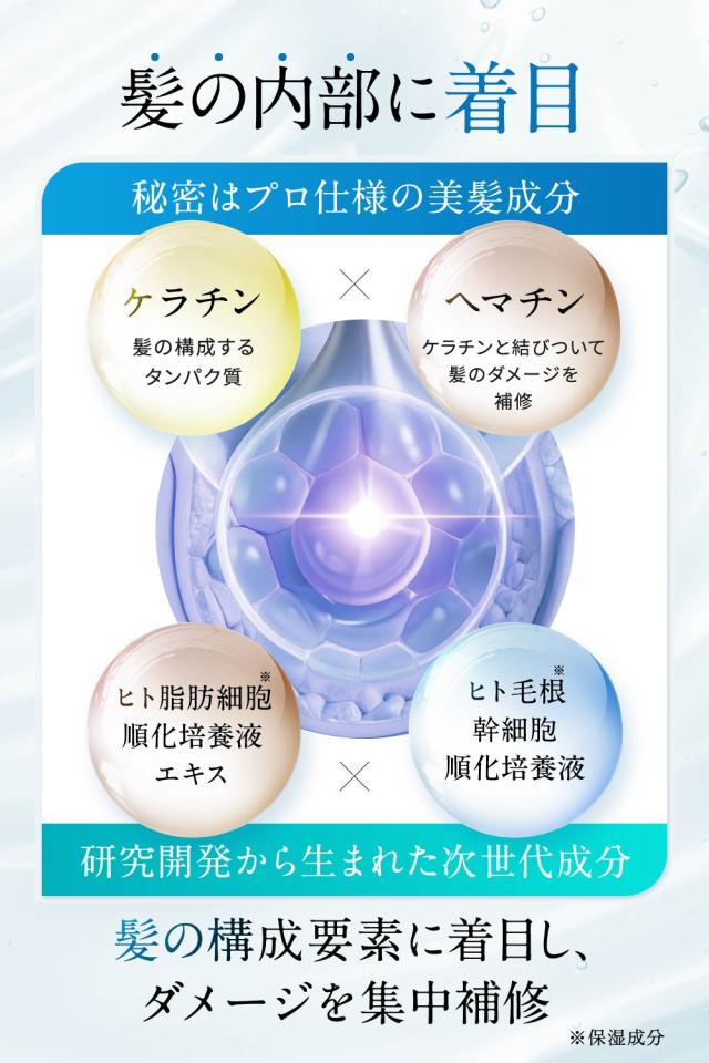 ◆ 【タンパク質×2種のヒト幹細胞培養液を配合】髪を構成するタンパク質「ケラチン」、ケラチンと結びついて髪のダメージを補修する「ヘマチン」をダブルで配合。また皮膚科学から生まれた次世代成分「ヒト脂肪細胞順化培養液エキス」、「ヒト毛根幹細胞順化培養液」を配合。