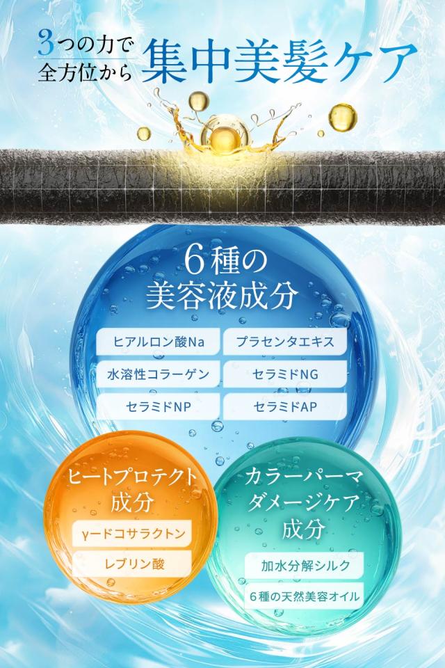 ◆ 【美容液成分×酸熱トリートメント×ダメージケア成分】6種の美容液成分(ヒアルロン酸Na、プラセンタエキス、水溶性コラーゲン、セラミドNG、セラミドNP、セラミドAP)、酸熱トリートメント成分、カラーパーマダメージケア成分を配合。