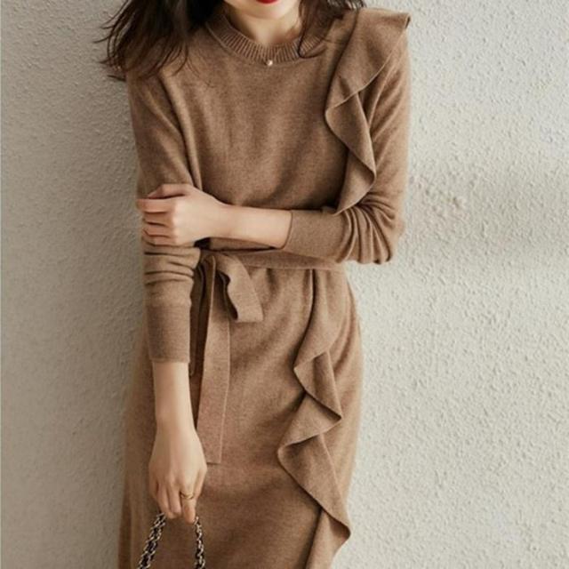 ワンピース ニットワンピース レディース 長袖 フリル エレガント あったか ベルト付き ファー ふわふわ 丸首 おしゃれ 秋冬 秋 ゆったりフォマル カジュアル