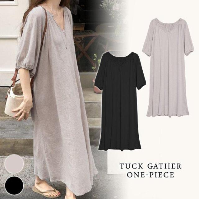 タック入りギャザーワンピース いつものスタイルに差をつけてくれる、 上質感たっぷりな 高見えタック入りワンピース。 ギャザー入りなので、ふわりとした 女性らしいシルエットです。 これ1枚でこなれ感の漂う スタイリングが完成♪