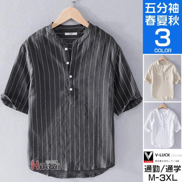 半袖シャツ メンズ リネンシャツ 五分袖シャツ ストライプシャツ スタンドカラーシャツ トップス 夏 薄手 父の日
