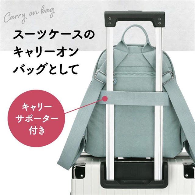 また、スーツケースに取り付けられるキャリーオンバッグとしても使用可能で、キャリーサポーター付きなので移動時の負担を軽減し、スムーズな旅をサポートします。