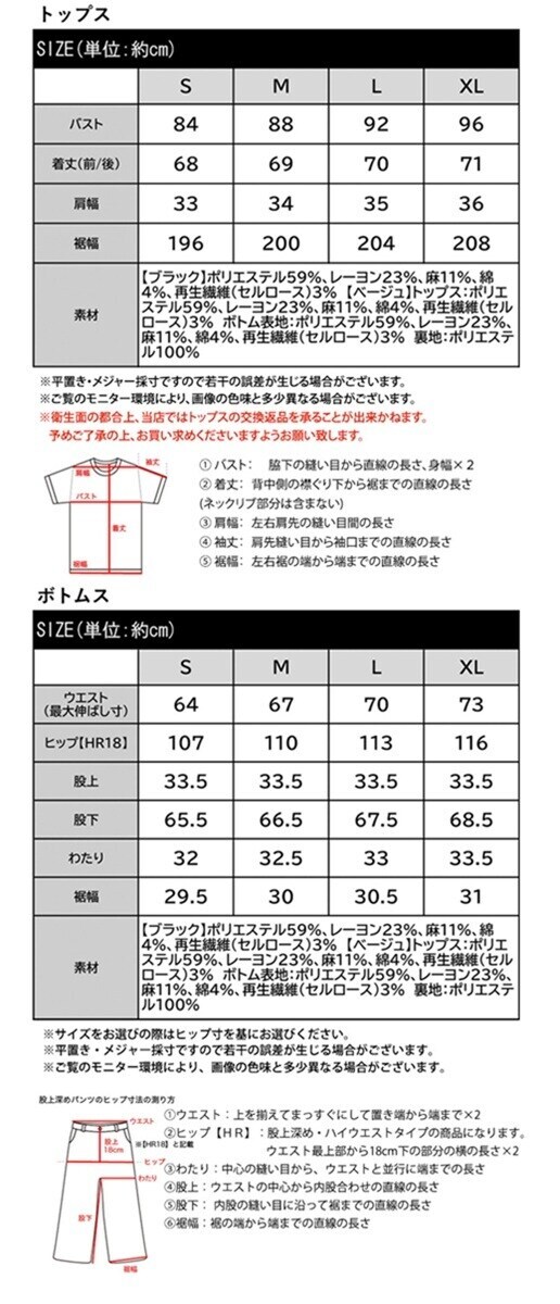 ■素材:【ブラック】ポリエステル59%、レーヨン23%、麻11%、綿4%、再生繊維(セルロース)3% 【ベージュ】トップス:ポリエステル59%、レーヨン23%、麻11%、綿4%、再生繊維(セルロース)3% ボトム表地:ポリエステル59%、レーヨン23%、麻11%、綿4%、再生繊維(セルロース)3% 裏地:ポリエステル100%