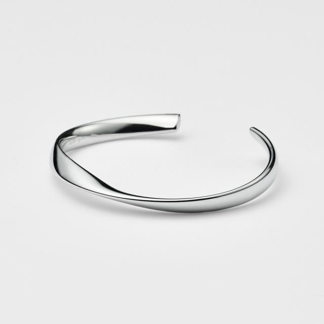 流れるようなフォルムが魅力の、大ぶりバングル。テクニカルな中空の線材にひねり加工を施し、水の流れを思わせるような有機的なフォルムに仕上げました。地金の面が生み出す繊細な輝きが、手元を美しく引き立ててくれます。大胆にひねりを加えた、シンプルながらも動きのあるフォルムが特徴。単体ではもちろん、他のブレスレットとの重ね着けにもおすすめです。ユニークな存在感を持ちながら、日常のスタイリングにも自然に馴染む一本です。※線材加工のためひねりの角度や位置など個体差があります。※パイプ材のため超音波洗浄は不可。
