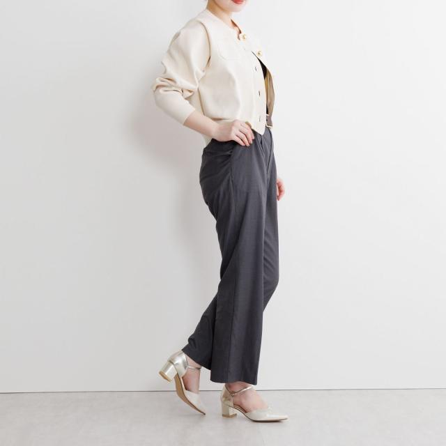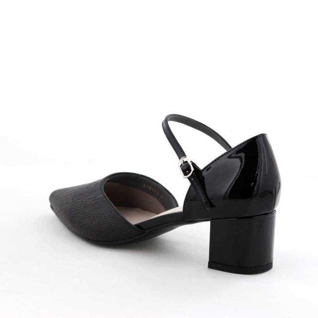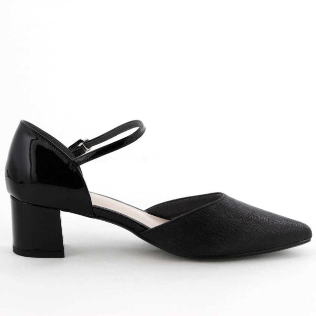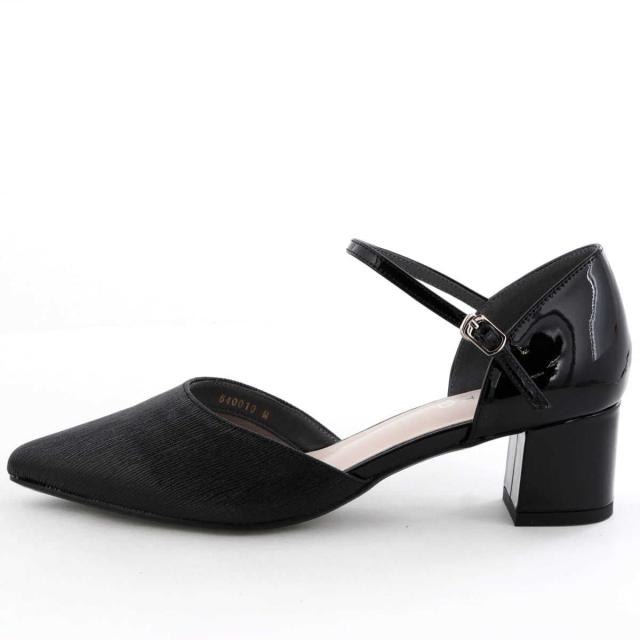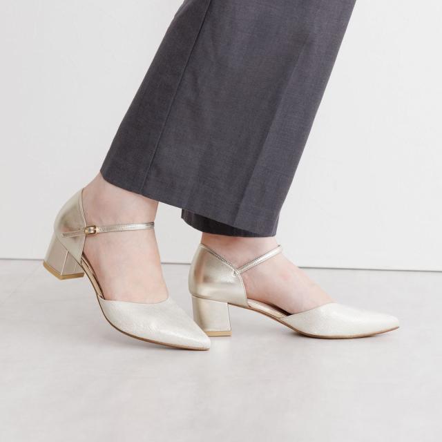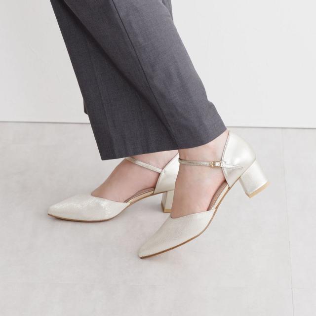 つま先のラメ素材が華やかなセパレートパンプス。 ブロックヒールで安定感がありながら、華奢なストラップとソフトなポインテッドトゥが上品な印象で、オケージョンシーンにぴったりのアイテムです。