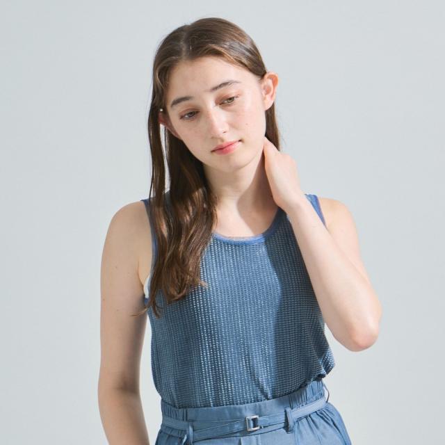 連続した細やかな柄織りが特徴で、軽さをだしたミニドビー素材をボディに使用し、ネック・アームラインをシアーチュール素材で切り替えニュアンスのある首元を演出するノースリーブトップスです。