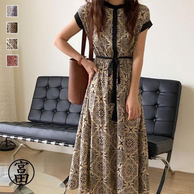 ロングワンピース フレンチスリーブ 半袖 ワンピース ペイズリー柄