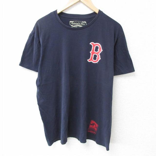 古着 半袖 Tシャツ メンズ MLB ボストンレッドソックス コットン クルーネック 紺 ネイビー メジャーリーグ ベースボール 野球 中古 古着